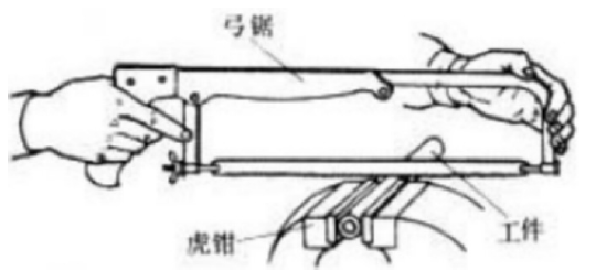 材料呈現(xiàn)開裂等情況的時(shí)分,就需求運(yùn)用鋸削操作進(jìn)行作業(yè)。鋸削的操作姿態(tài)和削銼的其是大體上是相同的,削銼首要?jiǎng)幼鬓k法是用右手將鋸弓手柄握好,左手上翹,用右手往下壓,回程的時(shí)分右手要向上抬。鋸削操作的時(shí)分需求特別留意的是鋸斷的時(shí)分需求將力氣削減一些,這樣就能夠防止在開裂時(shí)有意外產(chǎn)生,然后對操作工人或許機(jī)器造成損傷。與此一起,要特別留意防止鋸條猛然產(chǎn)生折斷失控的現(xiàn)象,在裝置鋸條的時(shí)分不能裝的太緊,這樣就能夠防止壓力太大而將鋸條折斷情況的產(chǎn)生。鋸削操作示意圖如圖2所示。