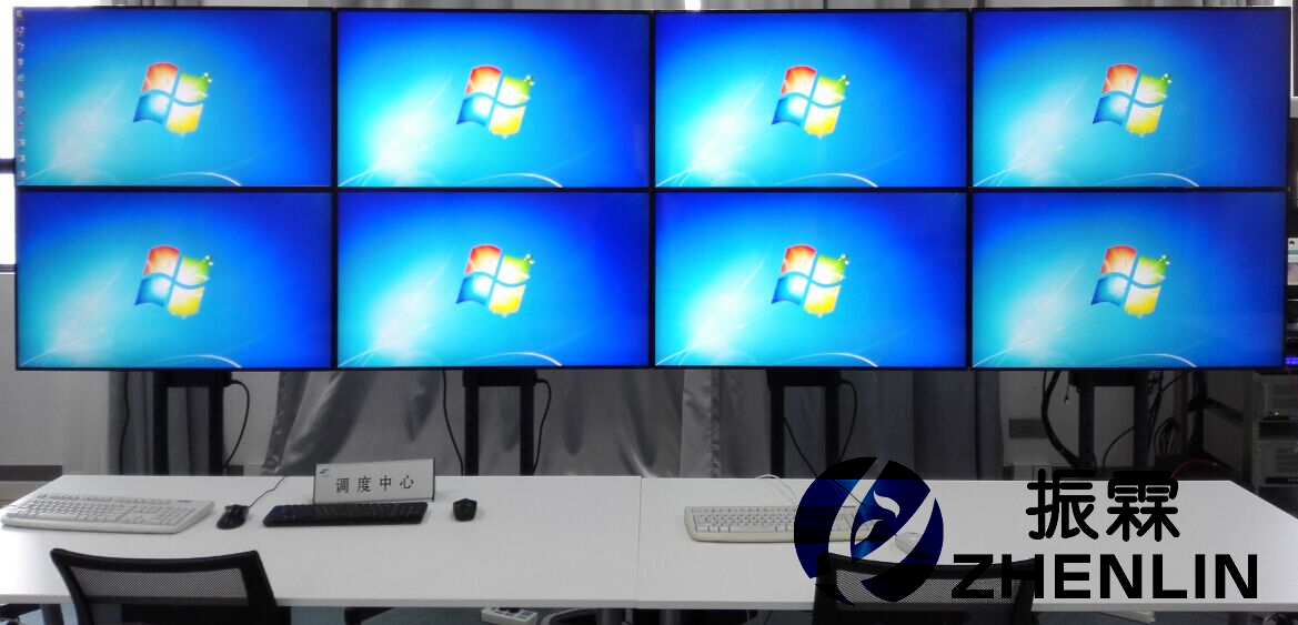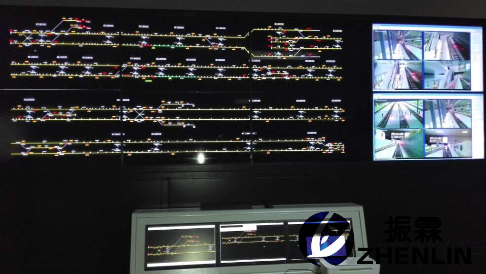 大屏顯示內(nèi)容的排列方式、視屏信號源可以隨時在線修改,用戶可以根據(jù)實際應(yīng)用需要,調(diào)整每一塊屏幕的顯示內(nèi)容。例如可將將綜合監(jiān)控、視屏監(jiān)控等其他信號投入大屏內(nèi),與信號系統(tǒng)一同顯示。拼接調(diào)試完成的調(diào)度實訓(xùn)中心綜合顯示大屏如下圖所示。
