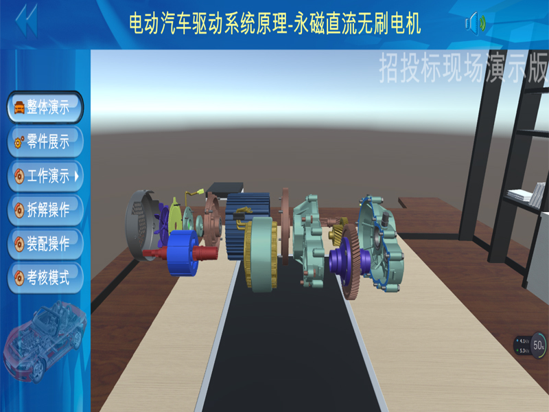 1.零件展示功能:以新能源汽車專用電機實物1:1建模在3D環(huán)境展示整體結(jié)構及各零部件結(jié)構;
