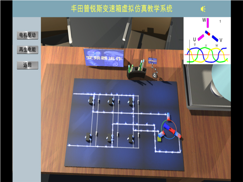 3.驅(qū)動原理演示功能:在3D環(huán)境下搭建控制器驅(qū)動電路包括igbt模型,電源模型,電動機模型,通過射線等特效動態(tài)演示控制器驅(qū)動電動機工作原理。