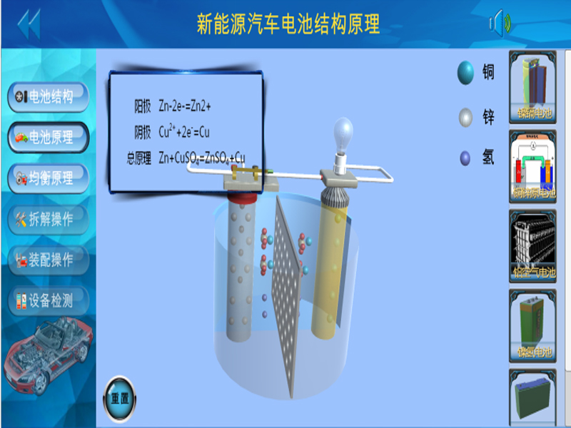 ?、佟‰姵胤诸惣安煌瑔坞姵亟Y(jié)構(gòu)展示功能:3D展示多種單電池內(nèi)部結(jié)構(gòu)和文字介紹電池的功能(★包含鎳鉻電池、銅鋅電池、鉛酸、鋰電池、鎳氫電池及空氣鋁電池的3d工作原理)