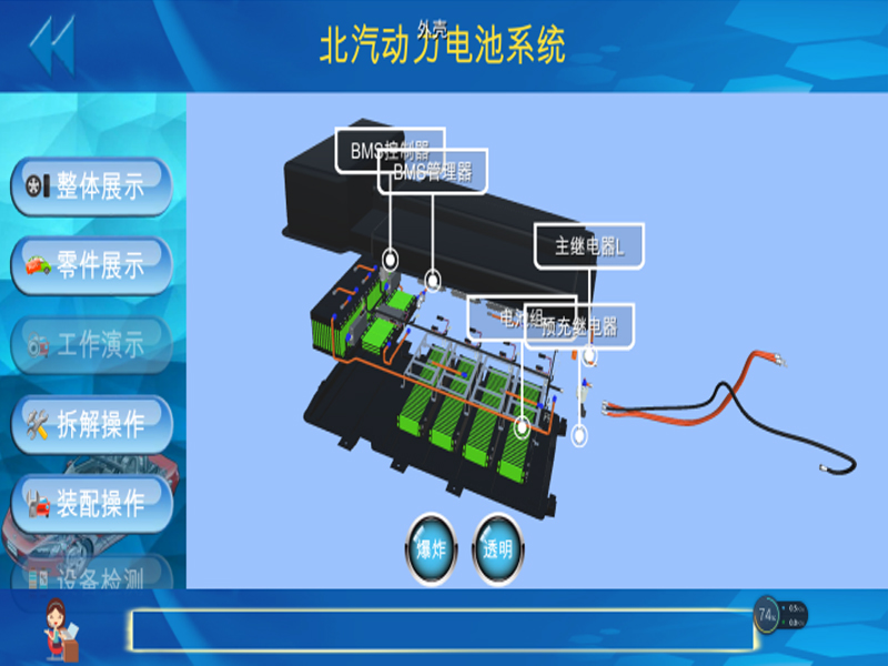 ⑤ 動(dòng)力電池虛擬拆裝: 按照原廠手冊(cè)要求進(jìn)行動(dòng)力電池拆裝順序?qū)嵱?xùn)??梢允謩?dòng)一步一步的進(jìn)行拆裝,也可以自動(dòng)演示拆裝過(guò)程。