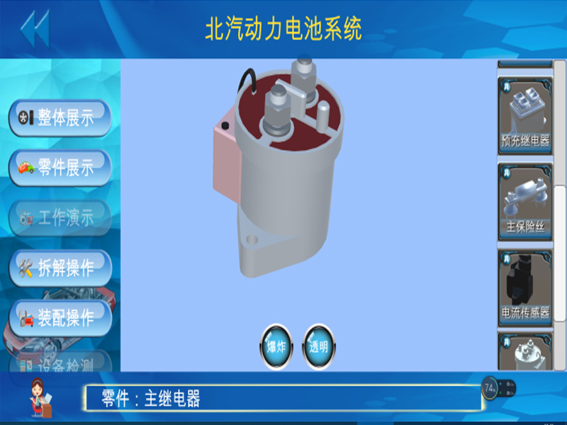 ② 動(dòng)力電池零部件展示:在三維虛擬仿真環(huán)境下展示正負(fù)極主繼電器、預(yù)充繼電器、預(yù)充電阻、安全插頭、保險(xiǎn)絲、電流傳感器、電池均衡控制器、電池管理模塊等,可以任意放大、縮小和360度旋轉(zhuǎn)。