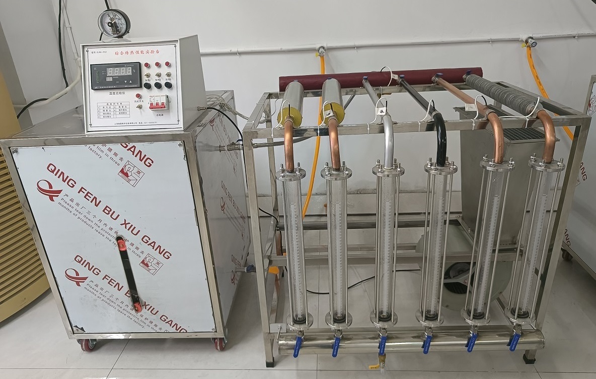 紫銅傳熱管道(銅裸管、涂黑管、翅片管、玻璃絲棉保溫管、鋸末保溫管、鍍鉻管各一組),調(diào)節(jié)閥門組,蒸汽發(fā)生器,熱風(fēng)幕風(fēng)機(jī),壓力控制器及溫度保護(hù)裝置,不銹鋼臺(tái)架及控制屏等。